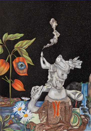 Encre de chine, graphite, crayon aquarelle, acrylique, pastel & collage sur papier.